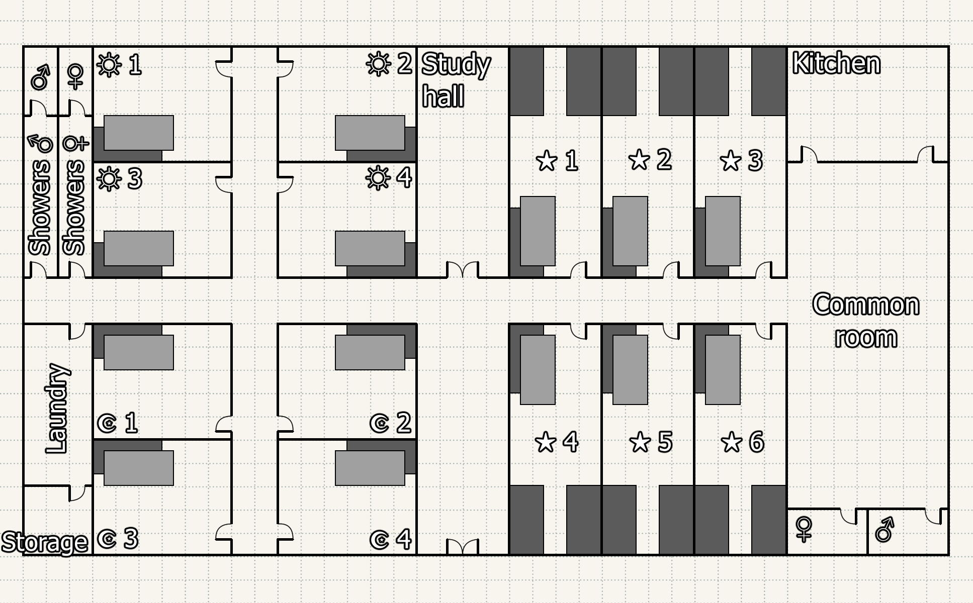 Bedrooms: The door of each room has either a sun, moon, or star, plus a number carved into the wood. The number of keys provided correspond to the number of beds in the room. Beds are twin sized, and come with a simple blanket and one pillow each. There are two closets in each room regardless of the number of people living in it. There is no other furniture.